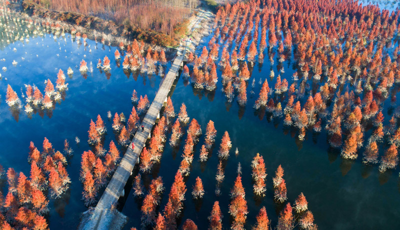 云南昆明水杉濕地冬日一景(1月5日無人機拍攝)。云南省被譽為“動物王國”和“植物王國”,當前生物多樣性相關(guān)指標居全國第1位,森林覆蓋率60.3%,居全國前列。
